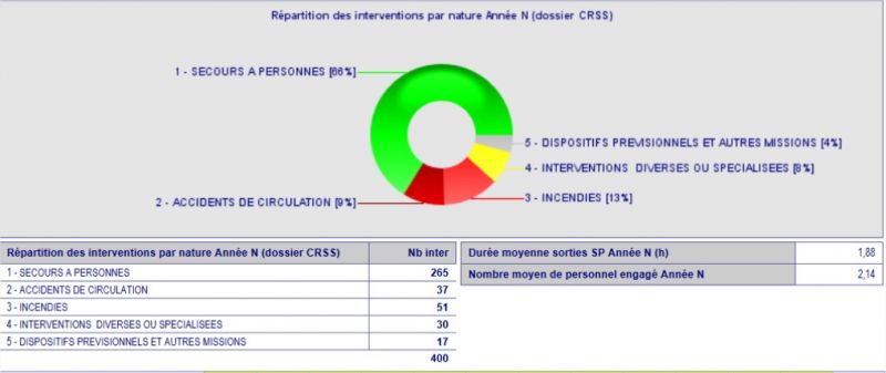 Le secours à personne reste prédominant et représente 2/3 des sorties. Dans une moindre mesure, les incendies (13%), les accidents de circulation (9%) et les opérations diverses (8%) complètent la large palette des missions assurées par la caserne de Chateauneuf.